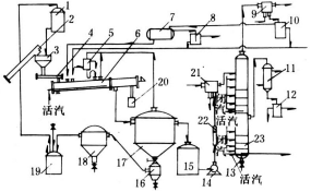 水蒸气作为加热和解吸介质加工松脂的方法。先用水蒸气将松脂加热熔解,使成流体状态(脂液),滤去大部分杂质;后用澄清的方法净制,进一步除去细小杂质和绝大部分水;将净制脂液用过热水蒸气蒸出松节油,得到松香。这三个工序是连续进行的。连续水蒸气蒸馏法马尾松松脂加工工艺流程如图1。松脂从上料螺旋机输入料斗,再经螺旋给料器不断送入连续熔解器,并加入适量的水和松节油。在熔解器中松脂被加热熔解。熔解脂液经过滤滤去大部杂质,流入连续澄清槽,杂质在残渣受器内定期排出。澄清后的脂液连续流入贮脂罐。中层脂液于中层脂液澄清槽澄清后流入压脂罐,用水蒸气压入中油贮槽回收。脂液泵将澄清脂液从贮脂罐抽出,经过转子流量计计量、预热器加热后连续送入蒸馏塔。蒸馏塔上段蒸出优油和水的混合蒸汽,经换热器(9)冷凝后流入优油油水分离器(10),分离后的优油流入贮槽,一部分送至熔解器作熔解松脂用,其余的经盐滤器除水后流入优油仓库。塔下段蒸出的重油和水的混合蒸汽由换热器冷凝后,经油水分离器分离水分。重油流入仓库。塔底部连续放出松香。