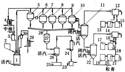 分三个工序间歇进行,其原理和工艺条件与连续水蒸气法基本相同。间歇水蒸气法马尾松松脂加工工艺流程如图2。松脂从螺旋输送机进入料斗,经密闭加料阀间歇流入熔解釜,以直接水蒸气加热熔解后的脂液用水蒸气压入过渡槽。熔解时逸出的松节油和水的混合蒸汽经气液分离器和换热器回收。熔解脂液在过渡槽贮留10分钟后经过滤器流入澄清槽组(7、8、9、10)澄清。澄清脂液从澄清槽(10)分次流入蒸馏釜,蒸出优油和水的混合蒸汽,经换热器(12)冷凝、油水分离器分层和盐滤器(14)除去残水,优油由贮槽送往油库。蒸完优油的脂液分次流入二级蒸馏釜,按温度先后蒸出中油、重油,中油和水的混合蒸汽经换热器(16)冷凝、油水分离器分出的中油由贮槽泵往加油罐作熔解松脂用。重油和水的混合蒸汽经换热器(16)冷凝、油水分离器分层和盐滤器除残水,除水重油经重油贮槽送往油库。过渡槽和澄清槽逸出的松节油蒸汽经换热器冷凝流入加油罐回收。澄清时的中层脂液经排渣槽在中层脂液澄清槽再澄清后于喷提锅回收松节油,并蒸煮黑松香。